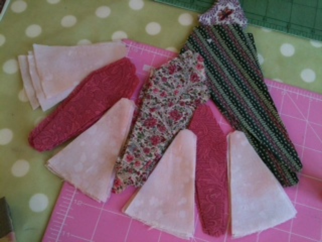 First task was to choose fabrics and as you may guess mine had to have some pink. Then came the cutting out. This was to be a hand piecing project and all the pieces were speedily cut out using a rotary cutter and the specialist plastic templates that were non slip. They were easy to see through too for fussy cutting. The templates had little holes for marking the seam lines and matching up points crucial to making a piece of patchwork that would lie flat. Petra did say that it could be machine pieced too but not for us this weekend. ( Guess who got to sit at the pink cutting board?).
